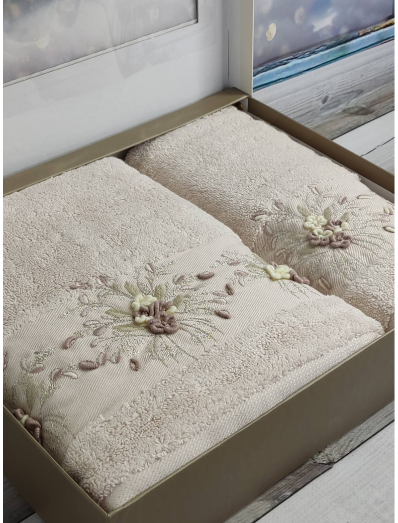 Ексклюзивні рушники з ніжної тканини пеньє – ідеальний подарунок!Насолоджуйтеся комфортом та стилем.Подарункова коробка. Вироблено в Туреччині Pupilla. Щільність махри 550 г/м2.В наборі один рушник банний 70х140см., один рушник для обличча 50х90см.