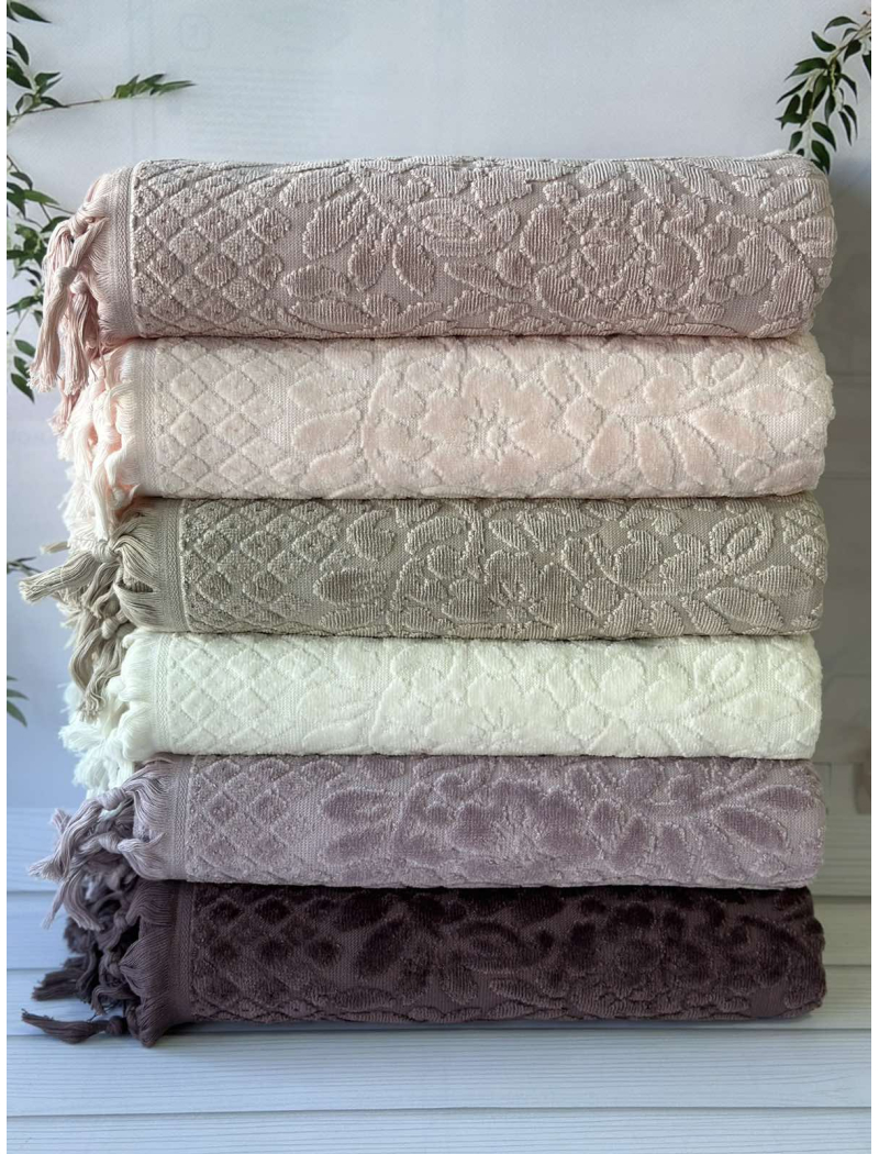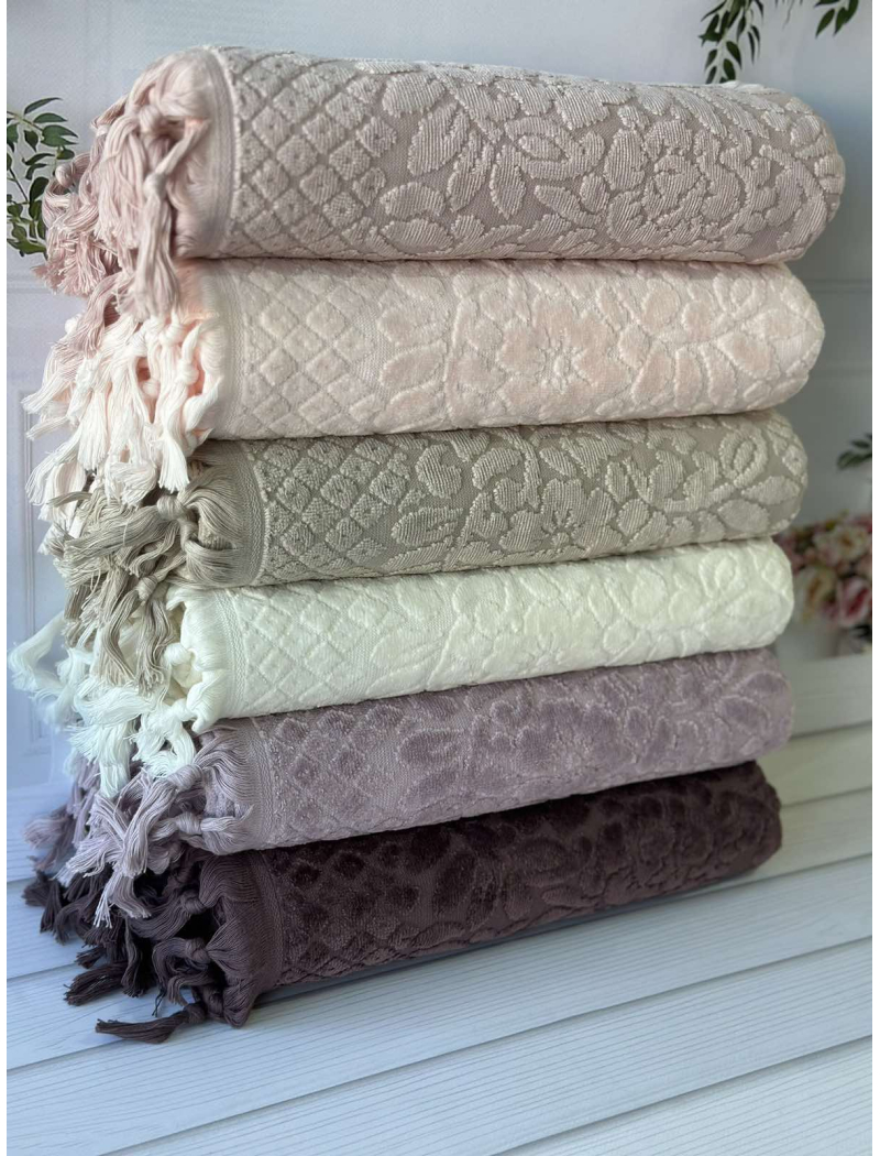 Однією з ключових особливостей є текстура тканини пеньє, яка надає рушникам оксамитовий, гладкий вигляд і відчуття. Це робить їх особливо приємними на дотик і забезпечує комфорт при використанні.