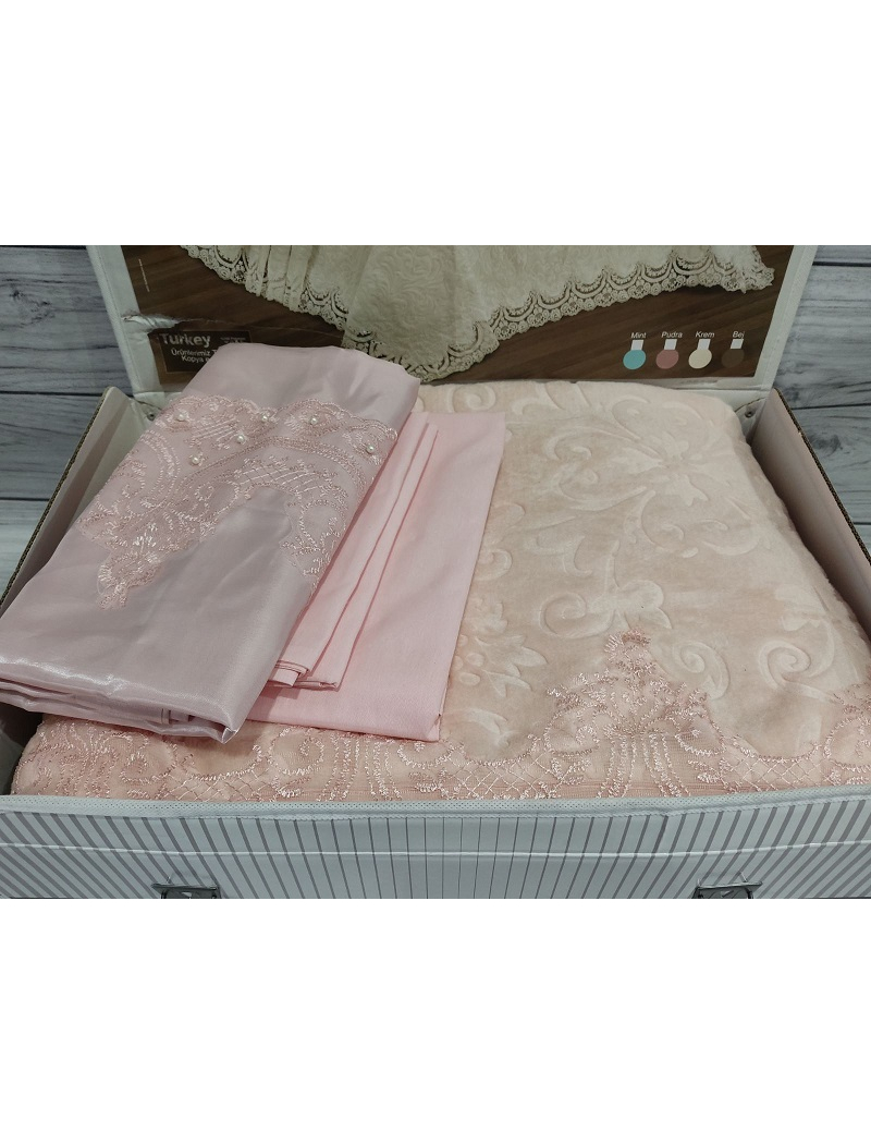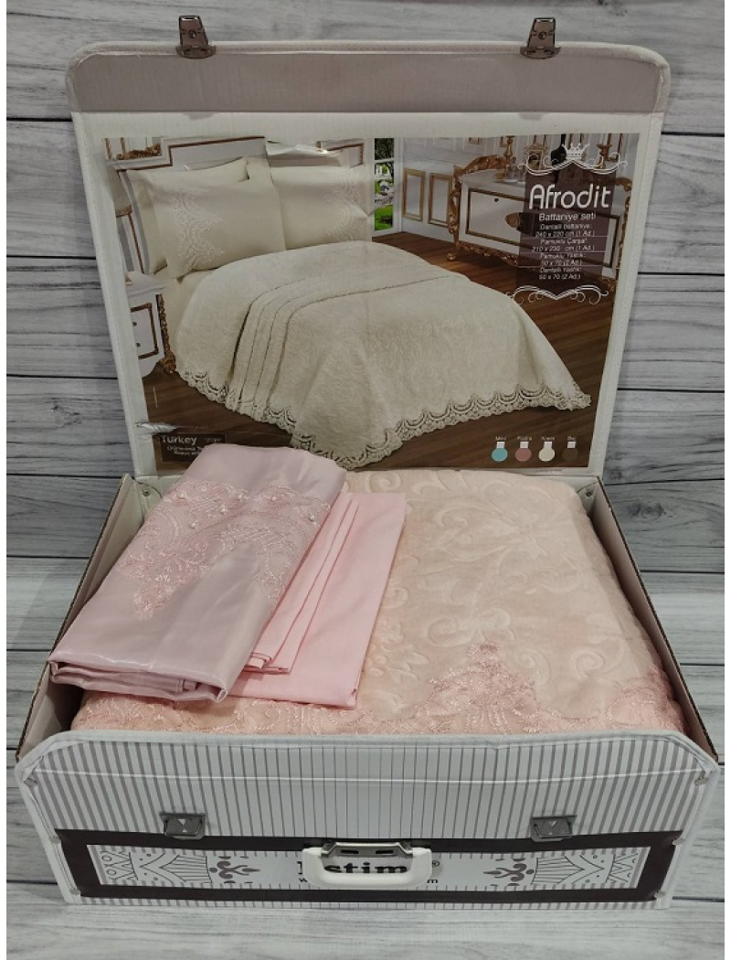 Подарунковий вишуканий набір з покривалом.Estima ТуреччинаВ наборі:- покривало акрілове з гіпюром 220х240см.- простирадло з ранфорсу (бавовна) 210х230см.- наволочки з ранфорсу (бавовна) 50х70см., 2 штуки- наволочки атласні (поліестер) 50х70см., 2 штуки УВАГА! В деяких наборах наволочки можуть бути повністтю з ранфорсу (бавовна) 50х70см., 4 штуки.