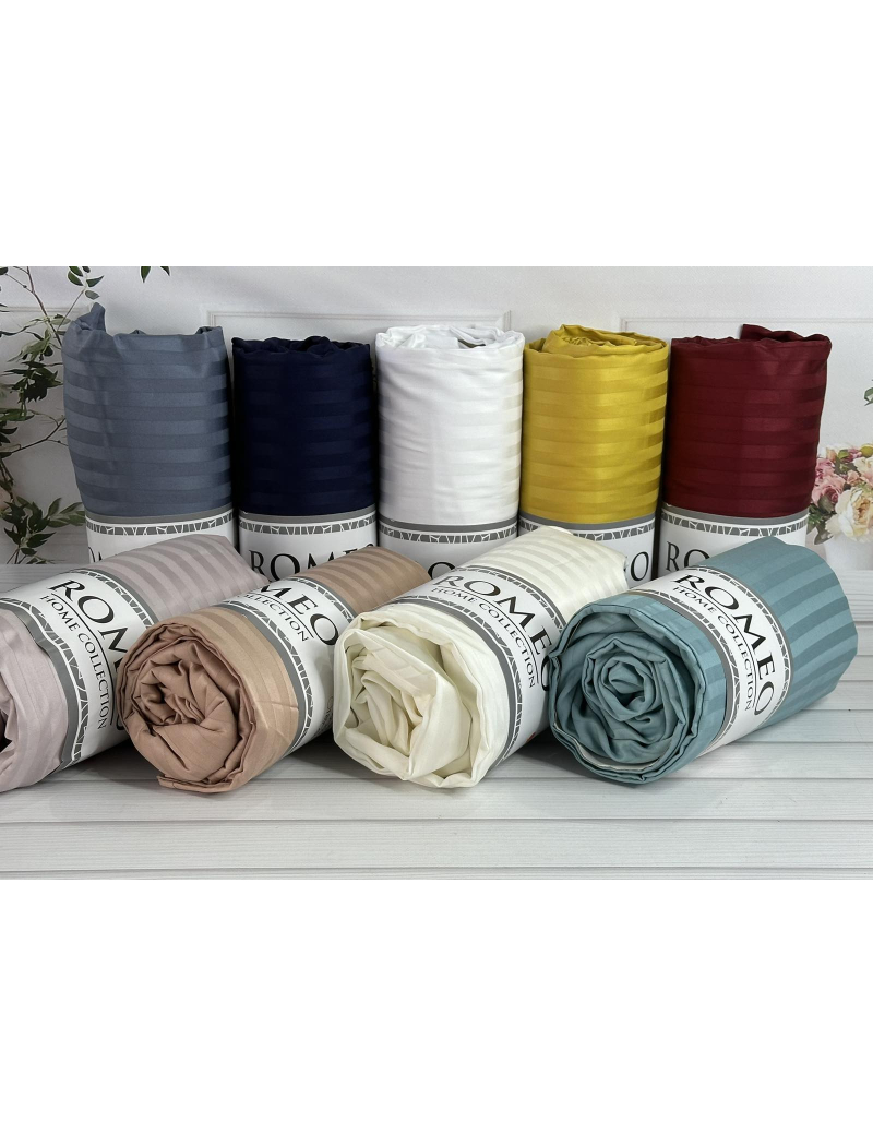 Сатинове простирадло на резинці. Одноколькорові в полоску.Виготовлені з тканини сатин-страйп з натуральної бавовни.Romeo home Туреччина.Розмір простирадла 160х200см., +30см., для повного обтягування матрацу.В наборі також є наволочки 50х70см., 2 штуки.