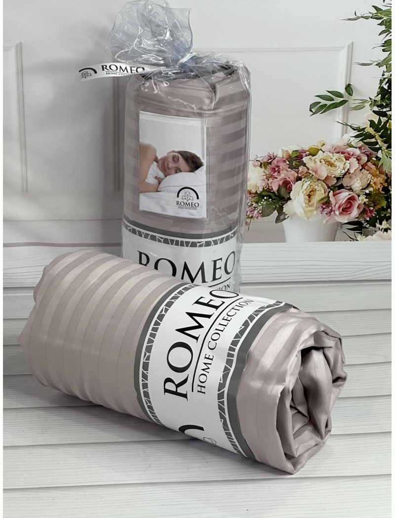 Сатинове простирадло на резинці. Одноколькорові в полоску.Виготовлені з тканини сатин-страйп з натуральної бавовни.Romeo home Туреччина.Розмір простирадла 160х200см., +30см., для повного обтягування матрацу.В наборі також є наволочки 50х70см., 2 штуки.